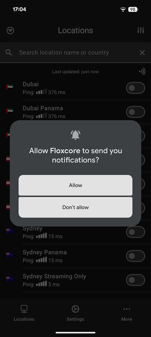Floxcore needs permission to send notifications. This is essential to keep the VPN connection alive for longer periods. Tap Allow.