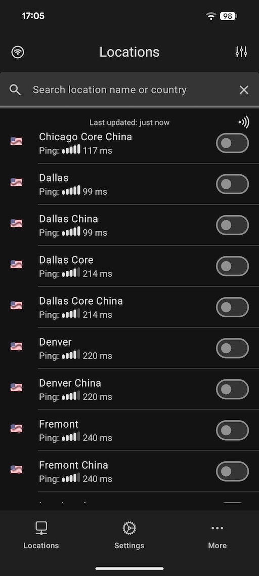 This option pings a server in each of the locations on your list. The ping result is then shown in list. (E.g. 100ms).