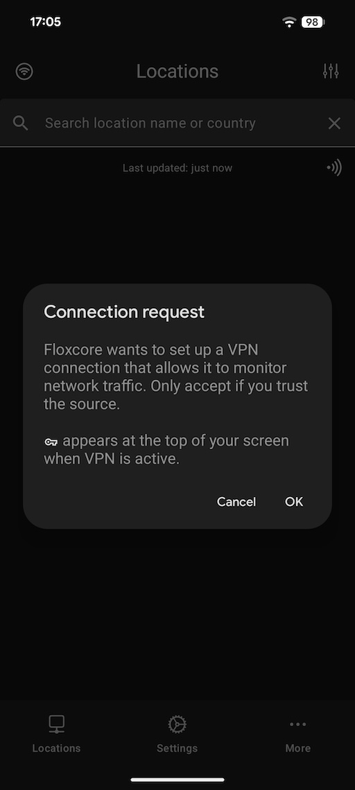 Floxcore needs permission to create a VPN connection. You need to do this only once. Tap OK.